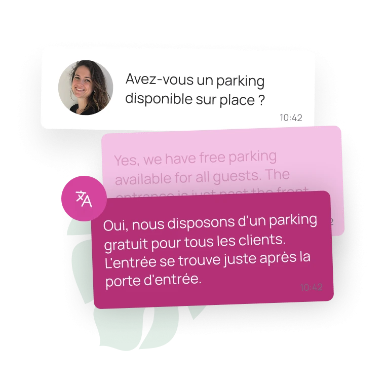 AI translates inbound text, drafts a reply and sends it back in the guest’s language
