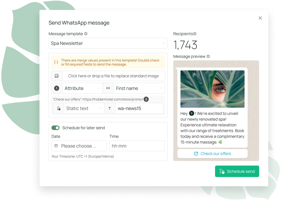 Manda messaggi di benvenuto personalizzati e informazioni essenziali sul soggiorno agli ospiti prima del loro arrivo usando la newsletter WhatsApp di Chatlyn. Offri loro un'anteprima esclusiva dei servizi dell'hotel, degli eventi speciali o delle opzioni di ristorazione per creare aspettativa.